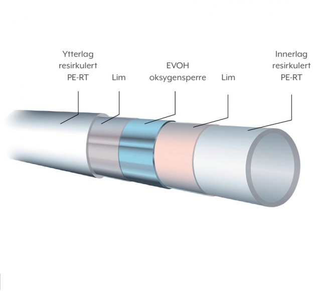 Gulvvarmerøret er et fleksibelt, 5-lags rør av resirkulert PE-RT med diffusjonssperre