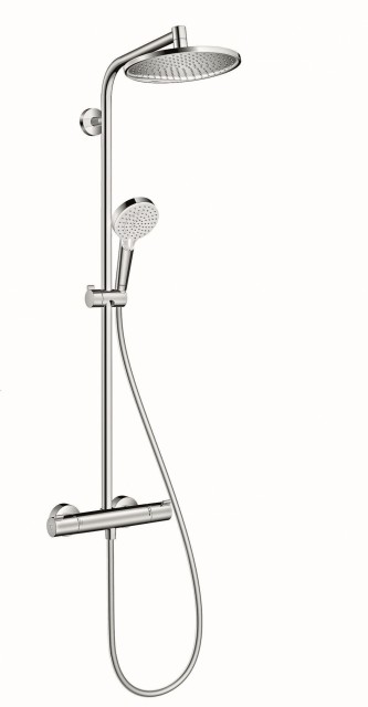 Takdusjsett med Ecostat 1001 CL termostat, hånddusj, dusjstang og dusjslange. Dusjen har to stråletyper; Rain og IntenseRain. Sikkerhetssperre på 40 °C og justerbart varmtvannsbegrensning. Dusjholderen kan justeres med 45°. Maksimal gjennomstrømningsmengde ved 3 bar er 16 l/min. QuickClean-teknologi for enkel rengjøring